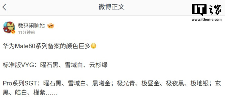 IT之家10月30日消息,博主@数码闲聊站今日爆料称华为Mate80系列备案的颜色巨多,并给出了部分信息。